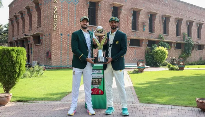 پاکستانی کپتان شان مسعود اور جنوبی افریقہ کے کپتان ایڈن مارکرم نے نیشنل کرکٹ اکیڈمی لاہور میں ٹیسٹ سیریز کی ٹرافی کی رونمائی کی۔