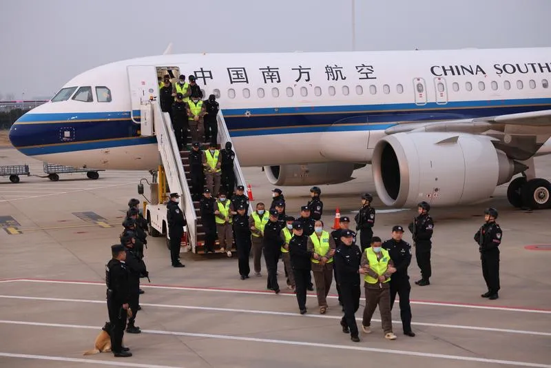 چینی پولیس افسران میانمار کے شہر میاودے سے فراڈ میں مشتبہ طور پر ملوث 200 چینی باشندوں کے ایک گروپ کو واپس لارہے ہیں۔(شِنہوا)