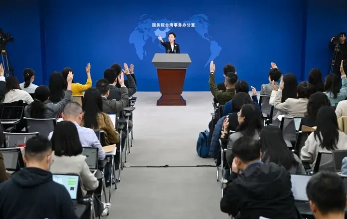چین کے دارالحکومت بیجنگ میں ریاستی کونسل کے امور تائیوان دفتر کی نئی ترجمان ژانگ ہان پریس کانفرنس کر رہی ہیں۔(شِنہوا)