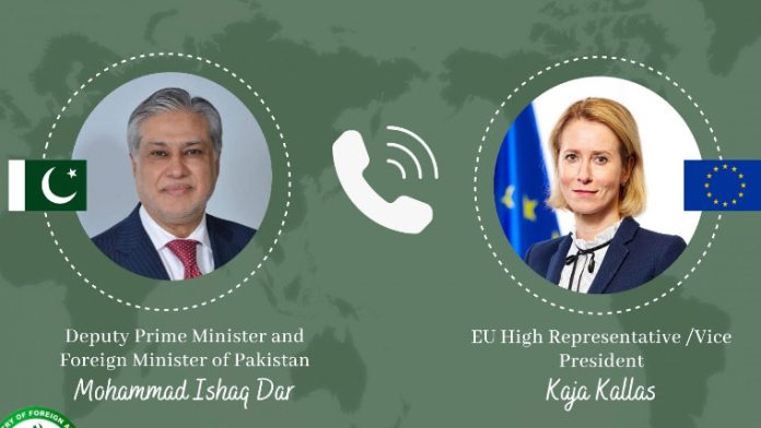 ترجمان دفتر خارجہ کے مطابق نائب وزیراعظم و وزیر خارجہ سینیٹر اسحاق ڈار نے یورپی یونین کی اعلی نمائندہ و نائب صدر کایا کالس سے ٹیلیفونک رابطہ کیا جس میں حالیہ علاقائی اور عالمی صورتحال پر تبادلہ خیال کیا گیا۔
