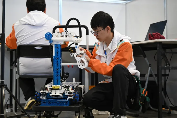 چین کے وسطی صوبے ہینان کے شہر ژینگ ژو میں تیسرے پیشہ ورانہ مہارت مقابلے کے دوران شرکاء خودکار موبائل روبوٹ کے مقابلے میں حصہ لے رہے ہیں-(شِنہوا)