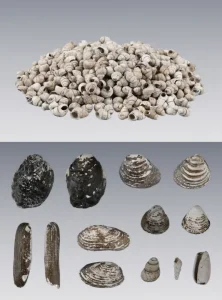 چین کے مشرقی صوبے جیانگسو کے شہر لی یانگ میں باؤجیا آثار قدیمہ کے مقام سے آبی خول دار جانوروں کی دریافت ہونے والی باقیات کا منظر۔(شِنہوا)