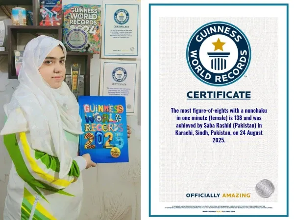 تفصیلات کے مطابق ایک منٹ میں نن چکو سے فیگر آف ایتھ بنانے کا عالمی ریکارڈ منظور کرلیا گیا۔ صبا راشد نے 120 کے مقابلے میں 138 مرتبہ نن چکو کو مہارت سے گھمایا۔