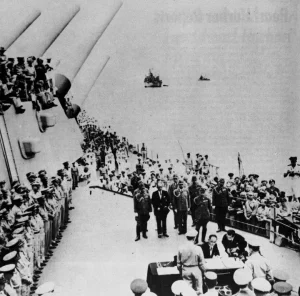 ٹوکیو بے میں لنگر انداز امریکی بحریہ کے جنگی جہاز یو ایس ایس میسوری پر جاپان کی ہتھیار ڈالنے کی تقریب کا منظر-(شِنہوا)