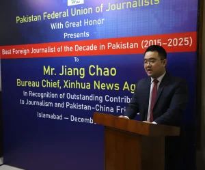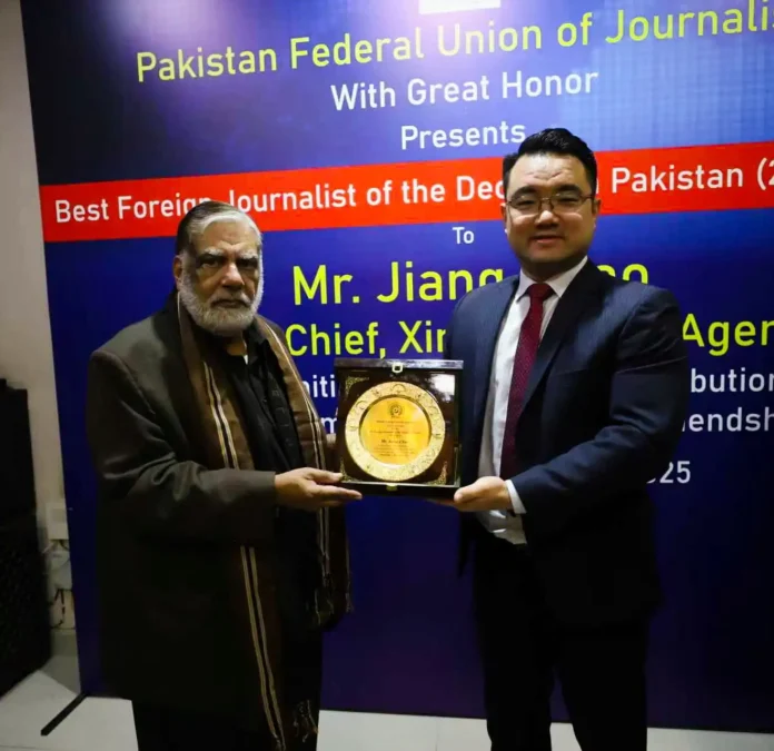 اسلام آباد: پاکستان فیڈرل یونین آف جرنلسٹس (پی ایف یو جے) نے شنہوا نیوز ایجنسی کے بیورو چیف جیانگ چاؤ کو پاکستان میں ایک دہائی پر محیط شاندار صحافتی خدمات، غیر جانبدار رپورٹنگ اور پاک چین دوستی کے فروغ میں نمایاں کردار ادا کرنے پر “2015 تا 2025 کے بہترین غیر ملکی صحافیِ دہائی” کے اعزاز سے نواز دیا۔