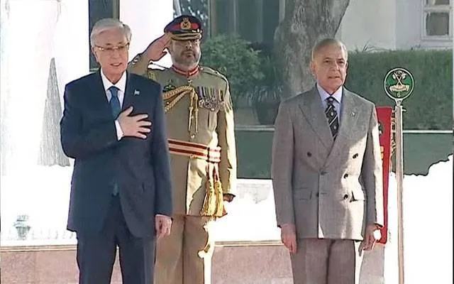 بدھ کو وزیراعظم ہائوس پہنچنے پر شہباز شریف نے معزز مہمان کا پرتپاک استقبال کیا، دونوں رہنماؤں کے درمیان مصافحہ اور خوشگوار جملوں کا تبادلہ ہوا، تقریب کے آغاز پر دونوں ممالک کے قومی ترانے بجائے گئے جس کے بعد مسلح افواج کے چاق و چوبند دستے نے قازقستانی صدر کو گارڈ آف آنر پیش کیا۔