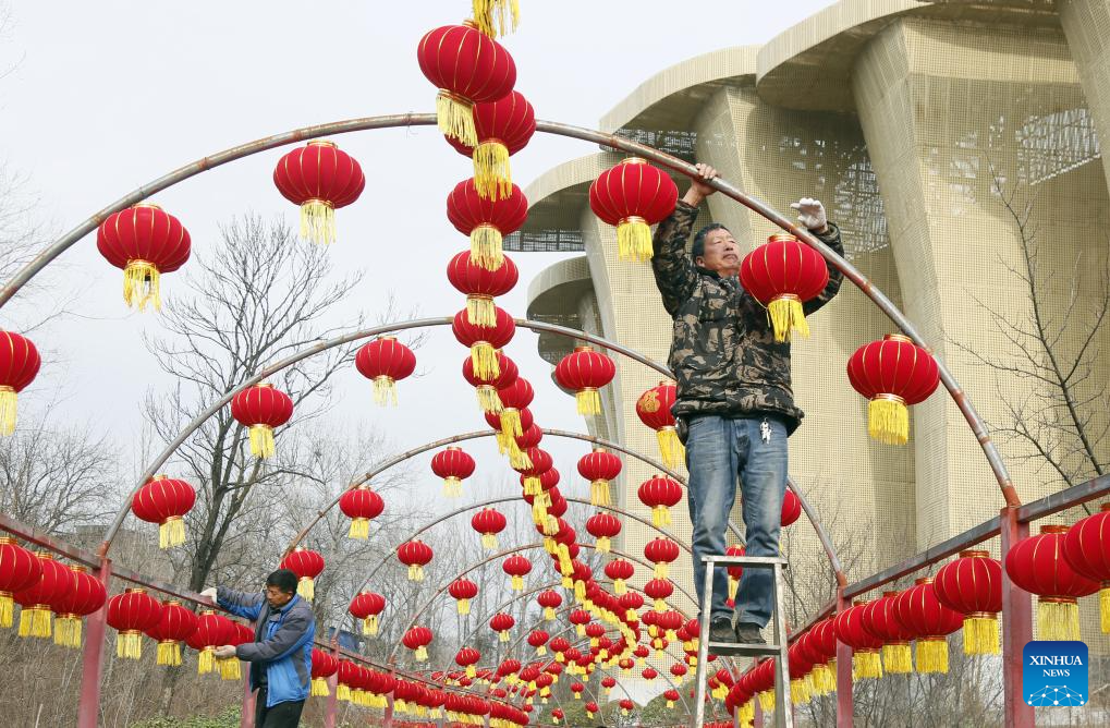 Staff members decorate a park with red lanterns in Luoyang City, central China’s Henan Province, Feb. 7, 2026.